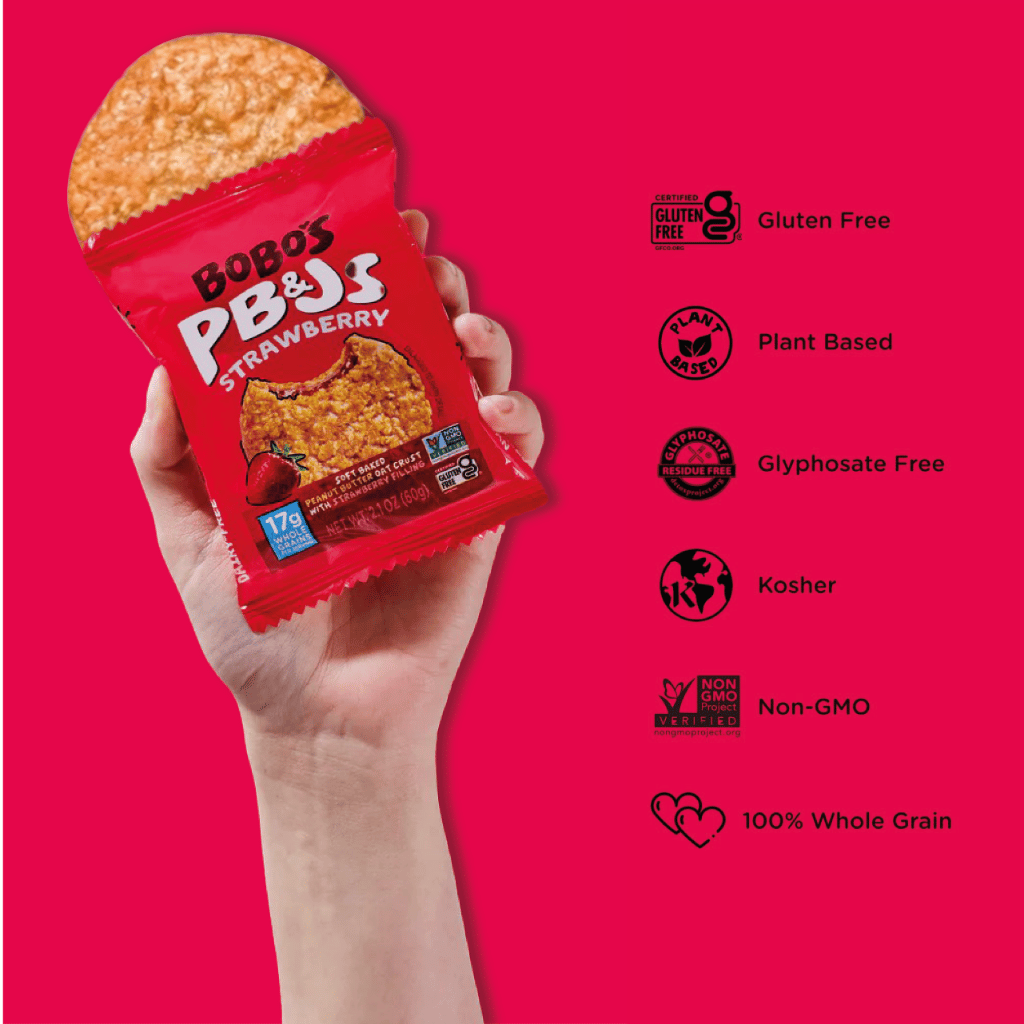 Since 2003, our Colorado bakery has dreamed up yummy oat snack recipes. One day, we thought, ‘what if we re-imagine the traditional Peanut Butter & Jelly sandwich?!’ Bobo’s could make one that isn’t messy and easy to take anywhere, and we’ll replace the bread with a totally gluten-free, nutrient dense, peanut-buttery oat crust! Voila, ‘PB&Js’ were born!