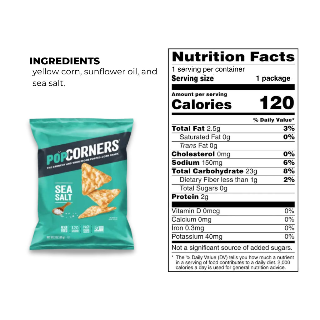Popcorners Sea Salt Popcorn Chips are a delicious, crunchy snack made from non-GMO corn, featuring a simple ingredient list with no artificial flavors, colors, or preservatives.