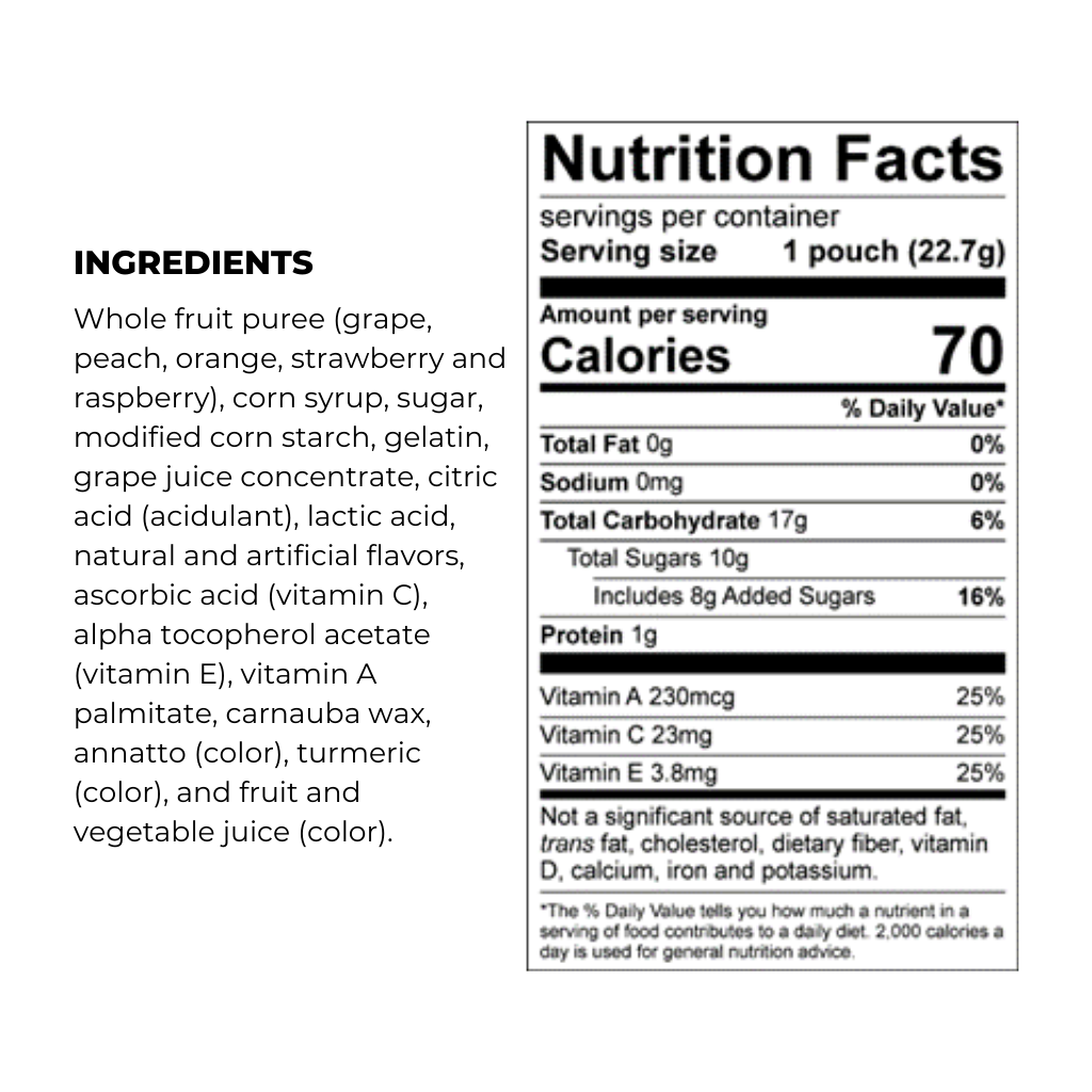 Fruit Puree (Grape, Peach, Orange, Strawberry and Raspberry), Corn Syrup, Sugar, Modified Corn Starch, Gelatin, Concord Grape Juice from Concentrate, Citric Acid, Lactic Acid, Natural and Artificial Flavors, Ascorbic Acid (Vitamin C), Alpha Tocopherol Acetate (Vitamin E), Vitamin A Palmitate, Sodium Citrate, Coconut Oil, Carnauba Wax, Annatto (Color), Turmeric (Color), Red 40, and Blue 1.